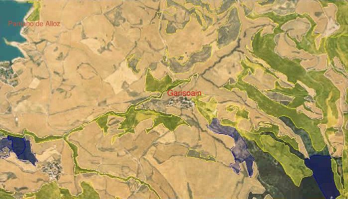 En la siguiente imagen aparecen resaltados en diversos colores los tipos de vegetación que nos podemos encontrar en los alrededores: